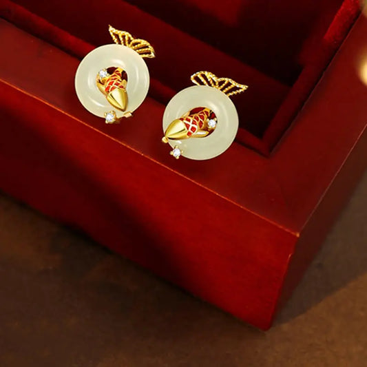 Buddha Stones Natural Hetian Jade 925 Sterling Silver Plated Gold Koi Fish Peace Buckle Luck Earrings
