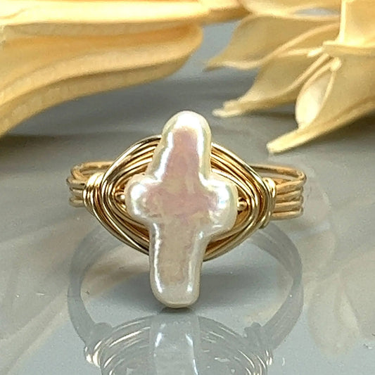 White Pearl Cross Wire Wrapped Ring