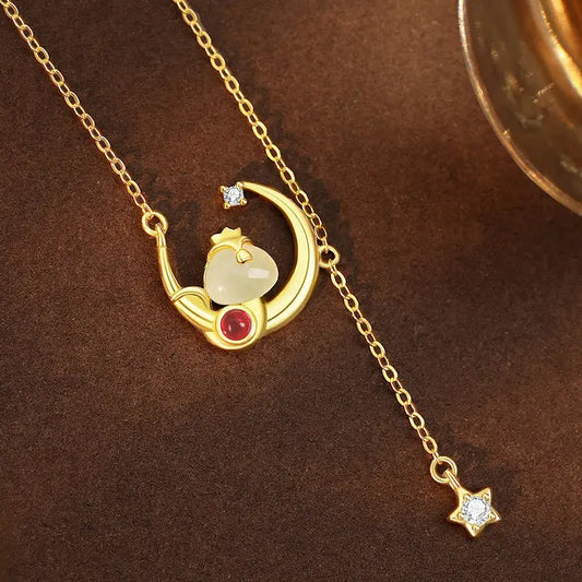 Buddha Stones 925 Sterling Silver Hetian Jade Red Agate Moon Year Of The Snake Blessing Necklace Pendant