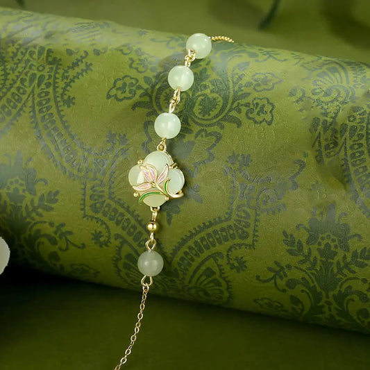 Buddha Stones 925 Sterling Silver Hetian Jade Magnolia Flower Butterfly Luck Chain Bracelet