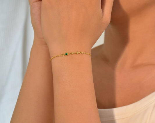 14K Gold Cross Bracelet with Birthstone