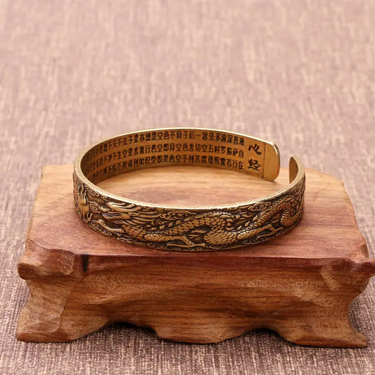 Buddha Stones Dragon And Phoenix Playing With A Pearl Heart Sutra Carved Copper Luck Bracelet Bangle